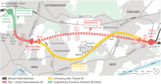 Im Rahmen des Schlüsselprojekts Bypass Bern Ost soll die A6 zwischen Muri und der Schosshalde auf einer Länge von 3,7 Kilometern in den Boden verlegt werden. Mit der Aufhebung der Trennwirkung entsteht eine einmalige Chance, den Lebensraum Bern Ost / Muri neu zu gestalten sowie die Aufenthalts- und Lebensqualität nachhaltig zu verbessern.