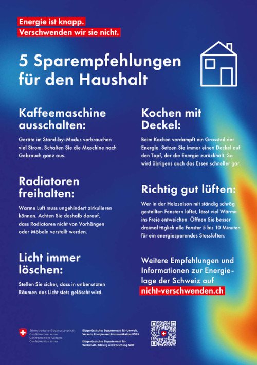 Die aktuelle europapolitische Lage führt zu einer Verknappung von Energie – auch in der Schweiz. Deshalb hat der Bund unlängst die Kampagne nicht-verschwenden.ch lanciert. Einfache und rasch umsetzbare Massnahmen sollen dazu beitragen, die Verschwendung von Energie zu vermeiden. Ziel ist es, alle Bevölkerungsgruppen für das Energiesparen im Alltag zu motivieren.